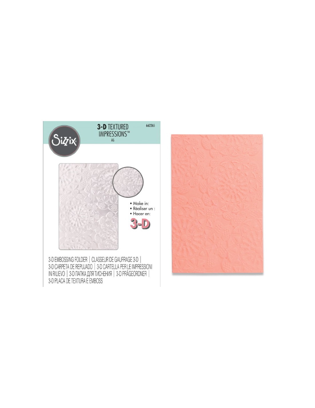 Aggiungi intricata bellezza alle tue crezioni con l'embossing 3D Doily. Rappresenta il design di un centrino che può essere ripetuto senza interruzioni. Perfetto per cartoline, scrapbooking e decorazioni per la casa.