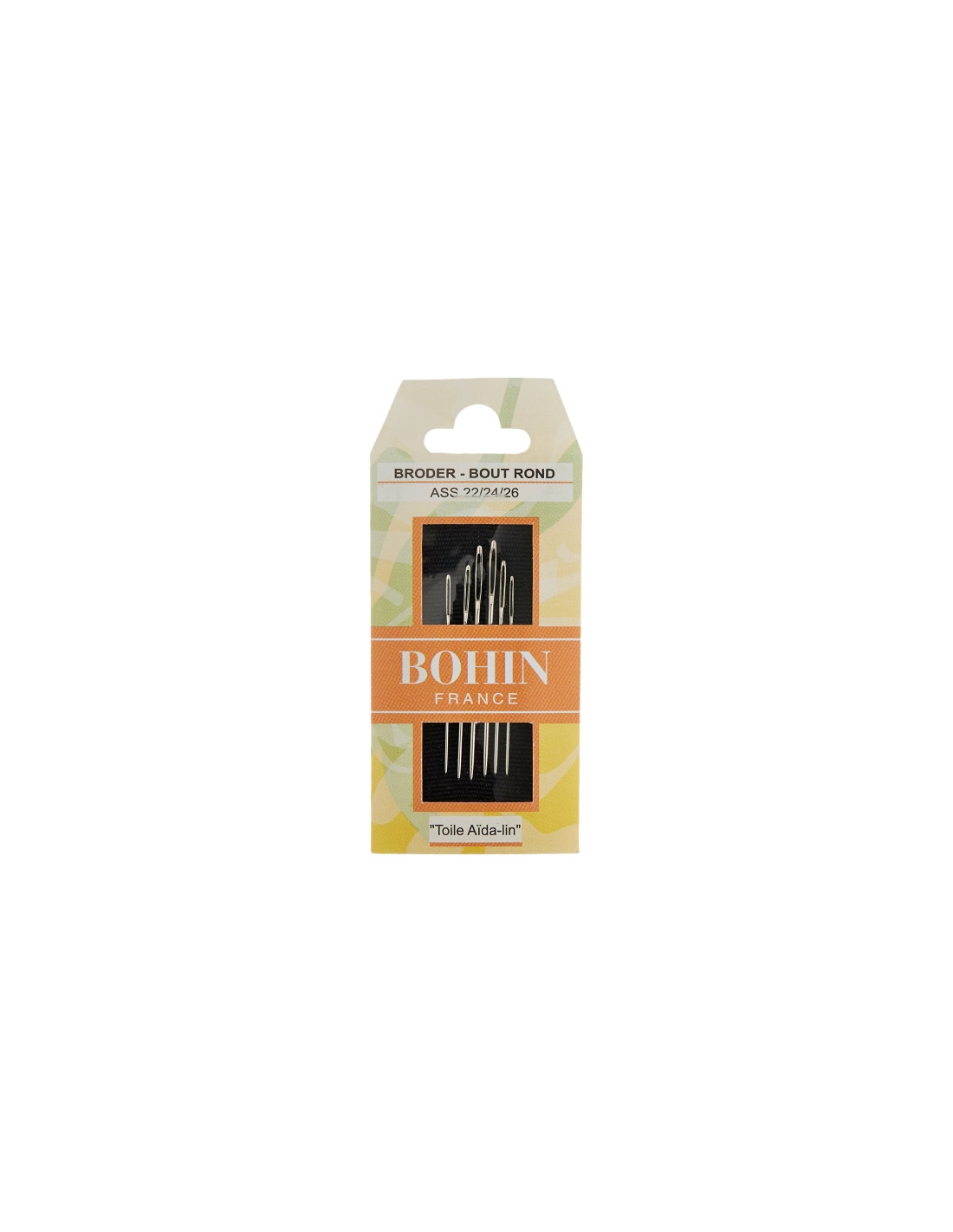 Questa cartina di Aghi Bohin include 6 Aghi senza Punta n. 22, 24 e 26 (2 cad.) per Ricamo su Tela Aida e Lino.
