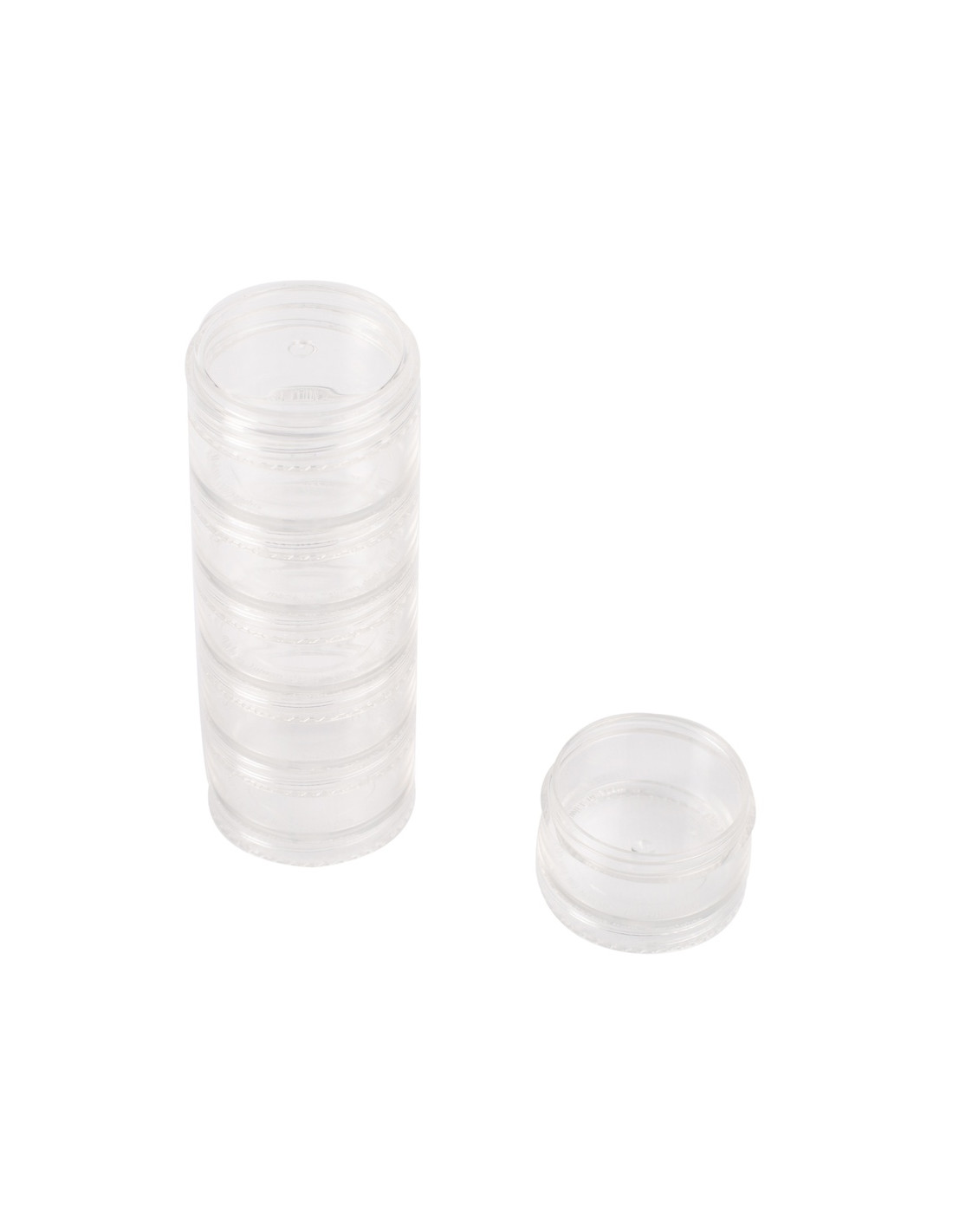 Blister composto da 6 piccoli contenitori impilabili tondi, in plastica trasparente con diamentro di 40mm.