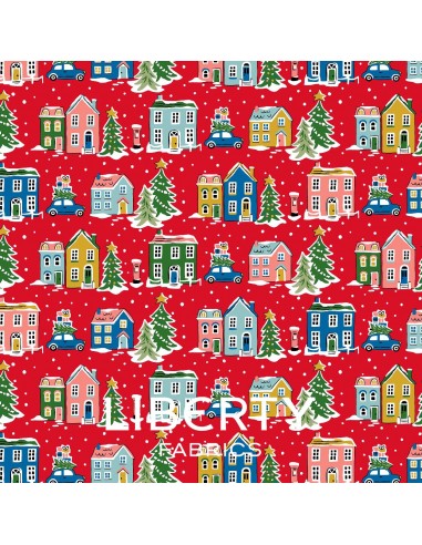 Deck the Halls Yuletide Cheer Holiday Village, Tessuto Rosso Villaggio di Natale - Liberty Fabrics