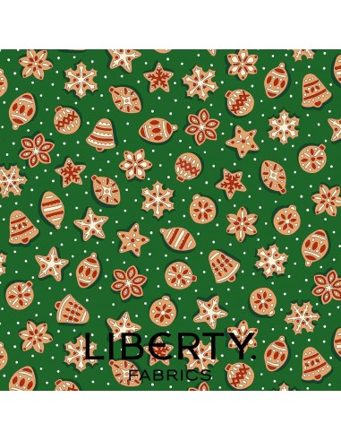 Festive Fair Gingerbread Delight, Tessuto Verde con Biscotti Speziati - Liberty Fabrics