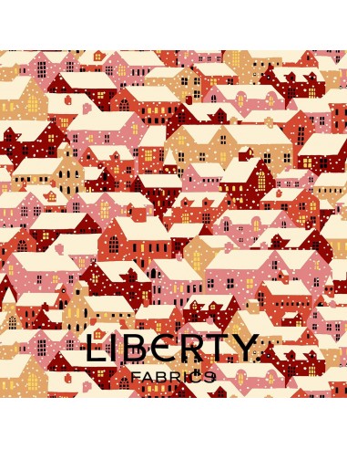 Festive Fair Snowy Rooftops, Tessuto con Case Rosse dai Tetti Innevati - Liberty Fabrics