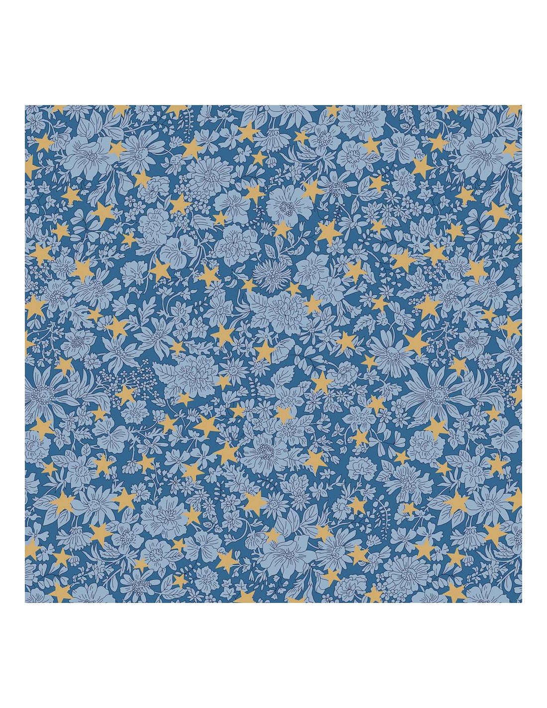 Festive Greetings, Emily Star, Tessuto blu con fiori tono su tono e stelle dorate - Liberty Fabrics
