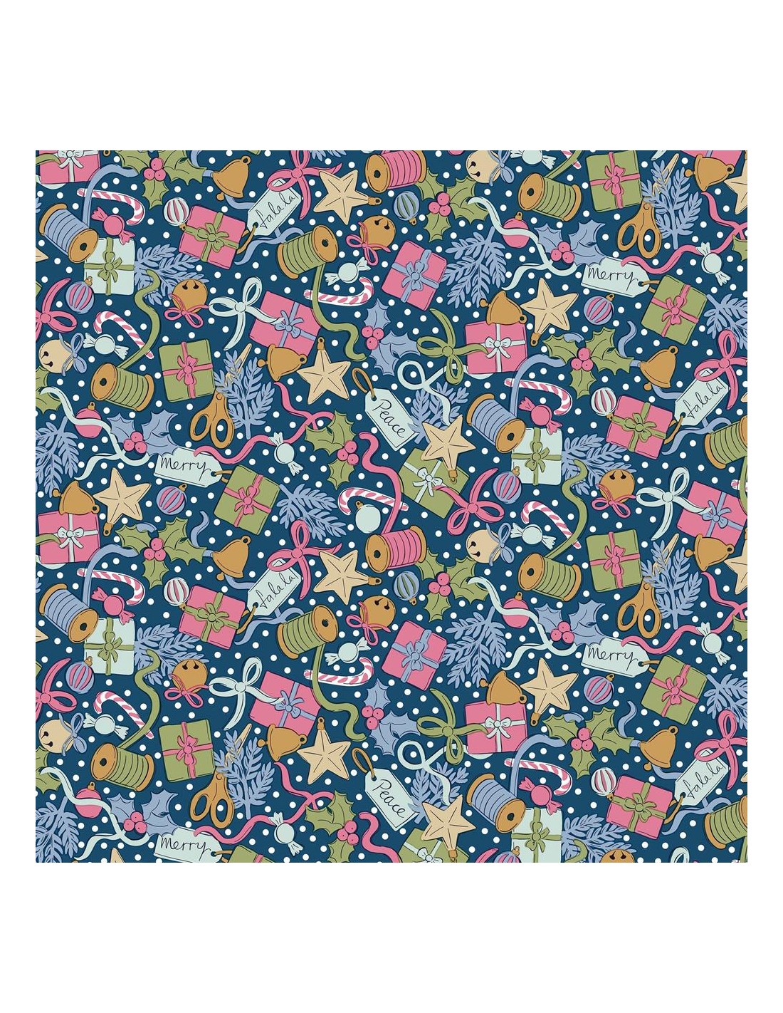 Traendo ispirazione dall'arte dell'incartamento dei regali, questo giocoso design è pieno di gadget per i regali delle feste. Disegnato e dipinto a mano con delicatezza nello studio di Liberty, presenta un assortimento sparso di regali, nastri, fiocchi, etichette regalo, forbici, bastoncini di zucchero, campanellini e rami di agrifoglio, creando un vivace mix di allegria natalizia.