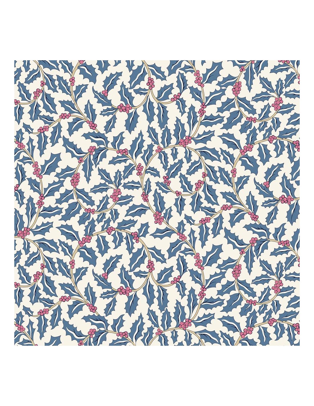 Festive Greetings, Swirling Holly, Tessuto panna con pungitopo blu - Liberty Fabrics