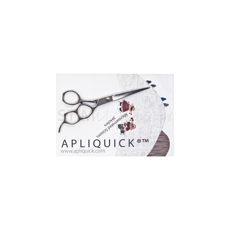 Forbici Apliquick grandi, in acciaio inossidabile. Impugnatura ergonomica a 3 fori per non stancare le dita e mantenere una posizione naturale. Le lame microdentate zigrinate si aggrappano al tessuto o alla fliselina termoadesiva evitando che possano scivolare sotto le lame. Taglia il tessuto senza sfrangiarlo. Ideale per tagli dritti e curve morbide.