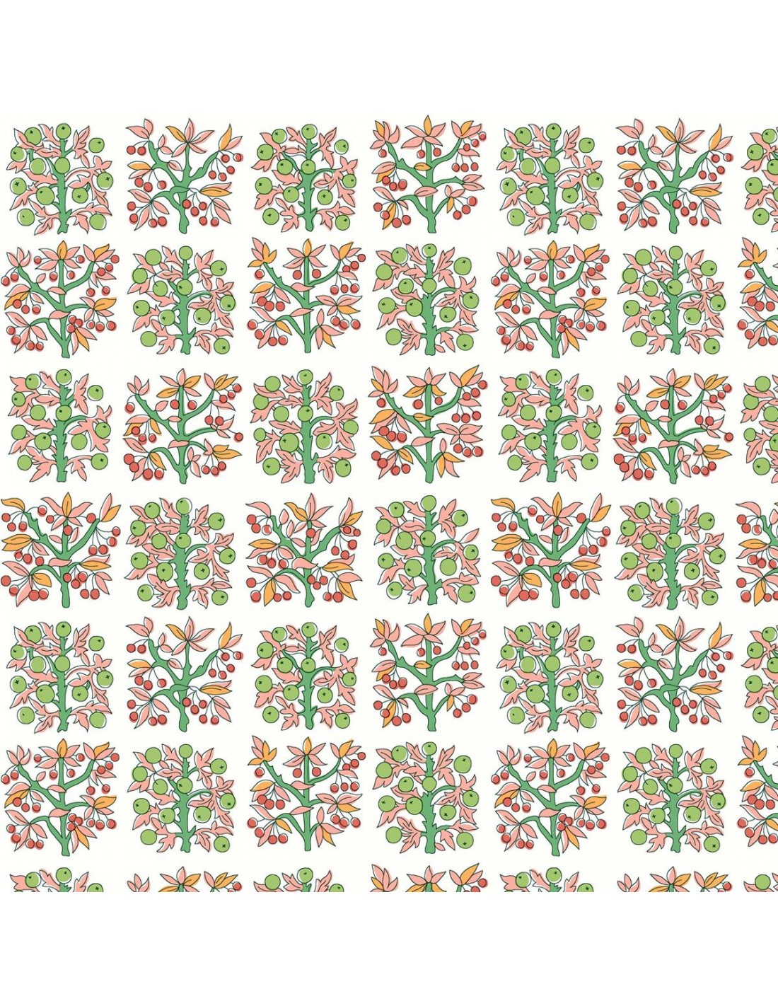 Gifts from the Garden, Orchard Delights, Tessuto con piante da frutto verde e rossi su fondo Bianco - Liberty Fabrics