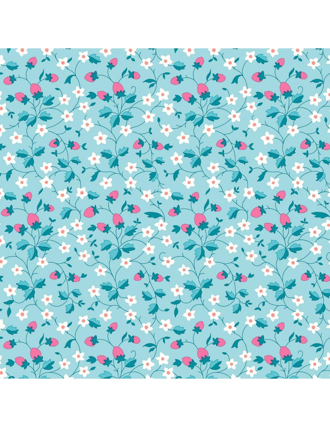 Gifts from the Garden, Strawberry Picking, Tessuto con fiori e fragole su fondo azzurro - Liberty Fabrics