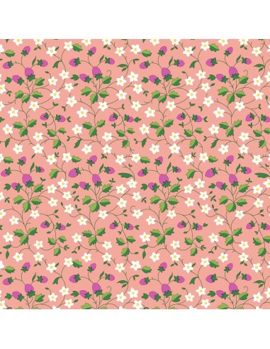 Gifts from the Garden, Strawberry Picking, Tessuto con fiori e fragole su fondo rosa pesca - Liberty Fabrics