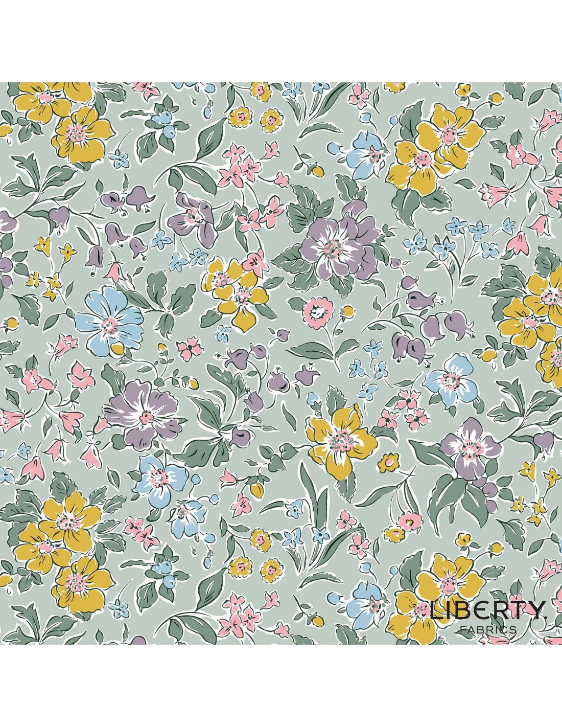 Heirloom Spring, Spring Petals, Tessuto con fiori colorati sparsi su fondo verde salvia - Liberty Fabrics