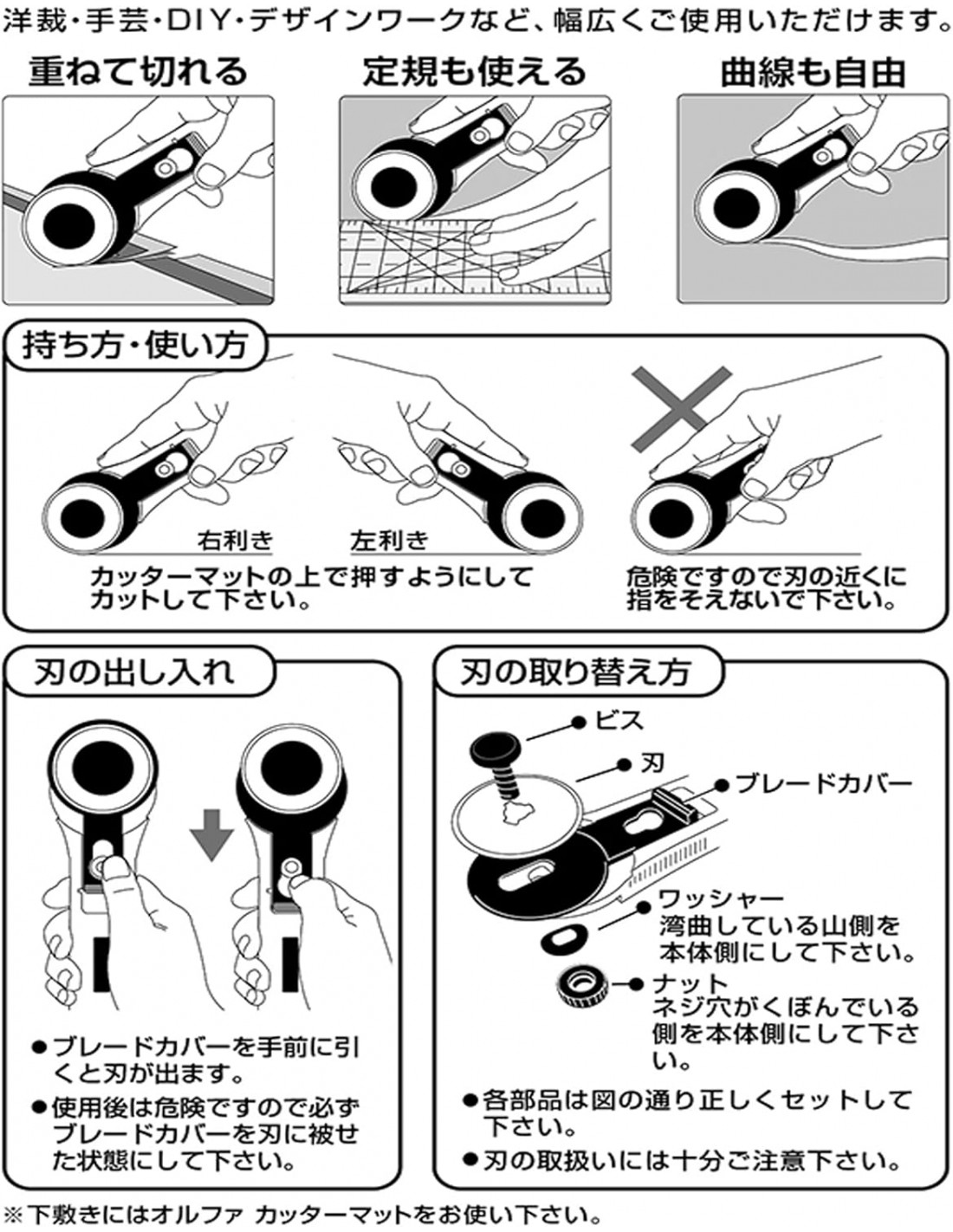 - Utilizzalo per tagliare il tessuto, anche in più strati. Ma anche per carte, tele, vinile, pelle, tappezzeria e non solo. Nota: utilizzare la stessa lama per materiali diversi velocizza la perdita di affilatura.