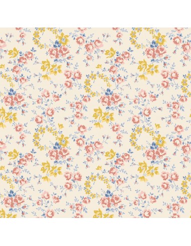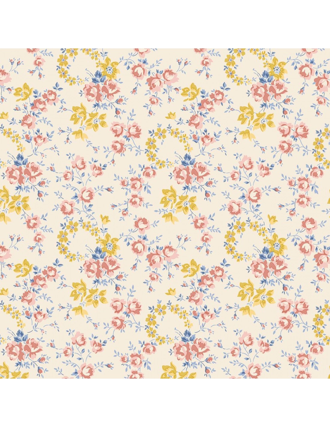 Palace Garden, Petal Crown, Tessuto con fiori azzurri e viola su fondo crema - Liberty Fabrics