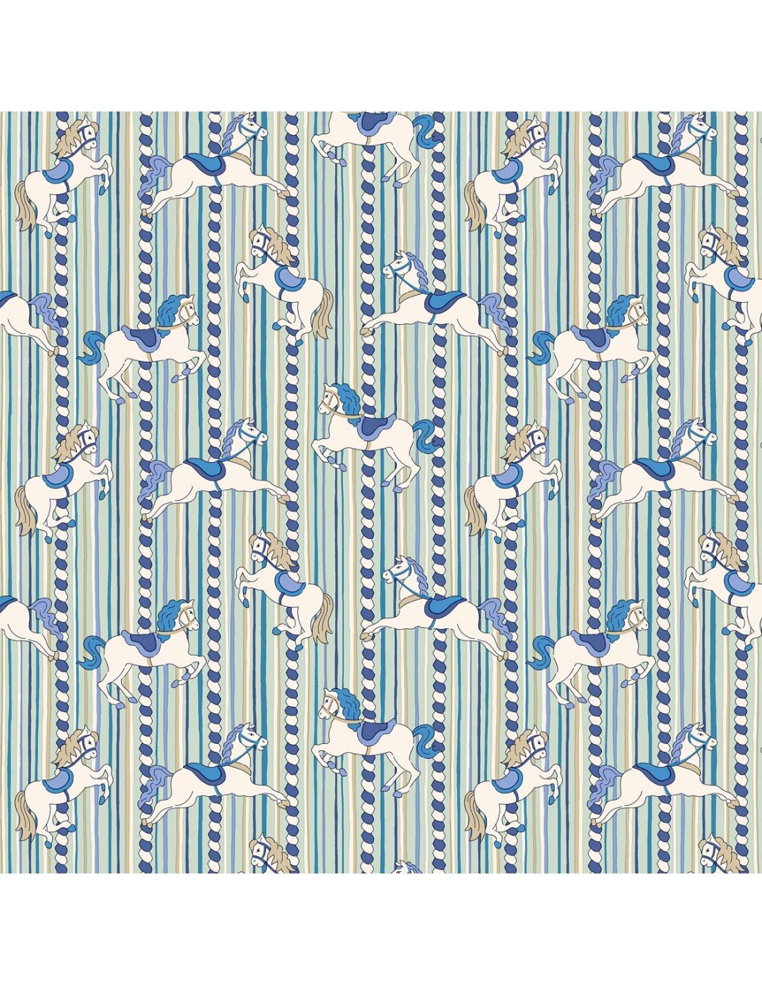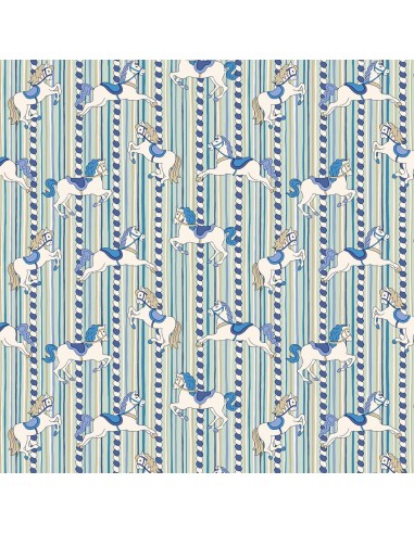 Summer Fair, Emolly Carousel, Tessuto Azzurro e Blu con righe e cavalli della giostra- Liberty Fabrics