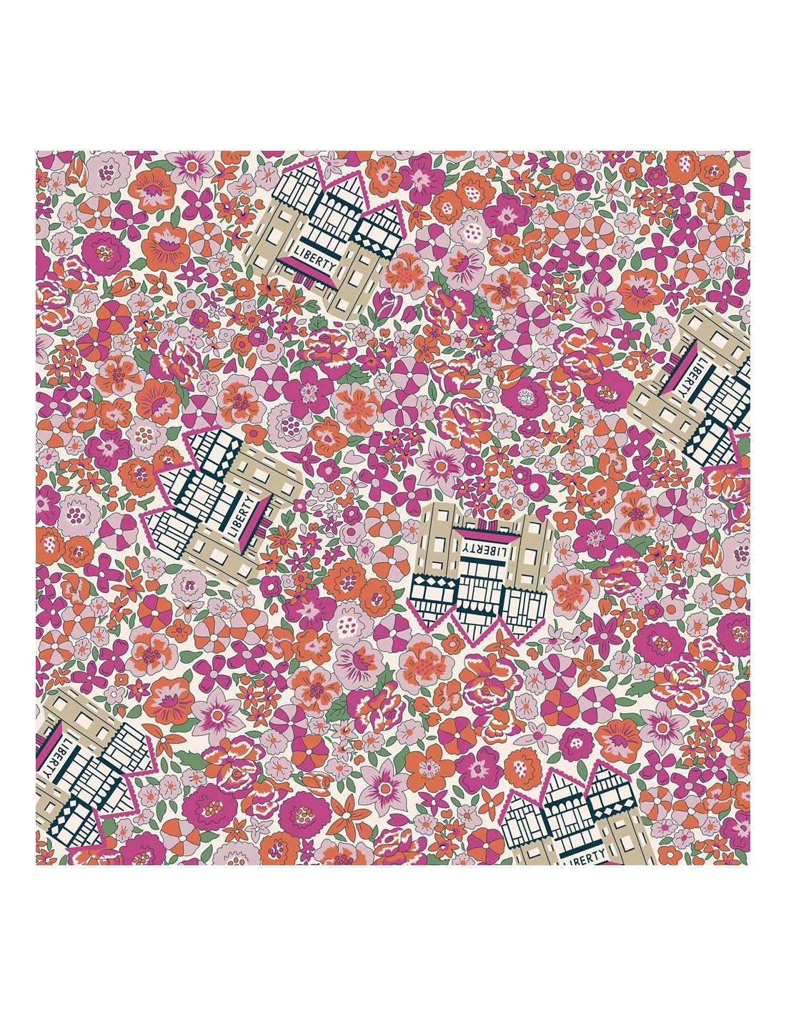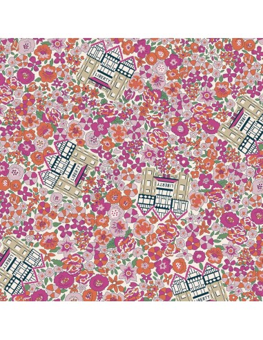 The Liberty Flower Shop, Liberty in Bloom, Tessuto con fiori fitti e edificio Liberty in ciclamino e arancio- Liberty Fabrics