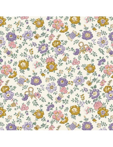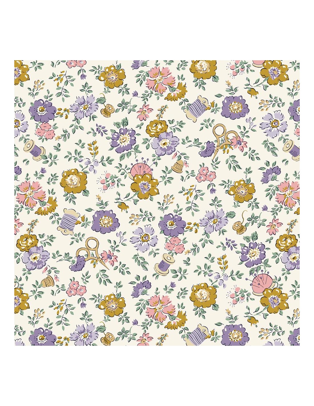 Tudor Celebration, Haberdashery Floral, Tessuto fondo crema con fiori e oggetti per il cucito in lilla e rosa - Liberty Fabrics