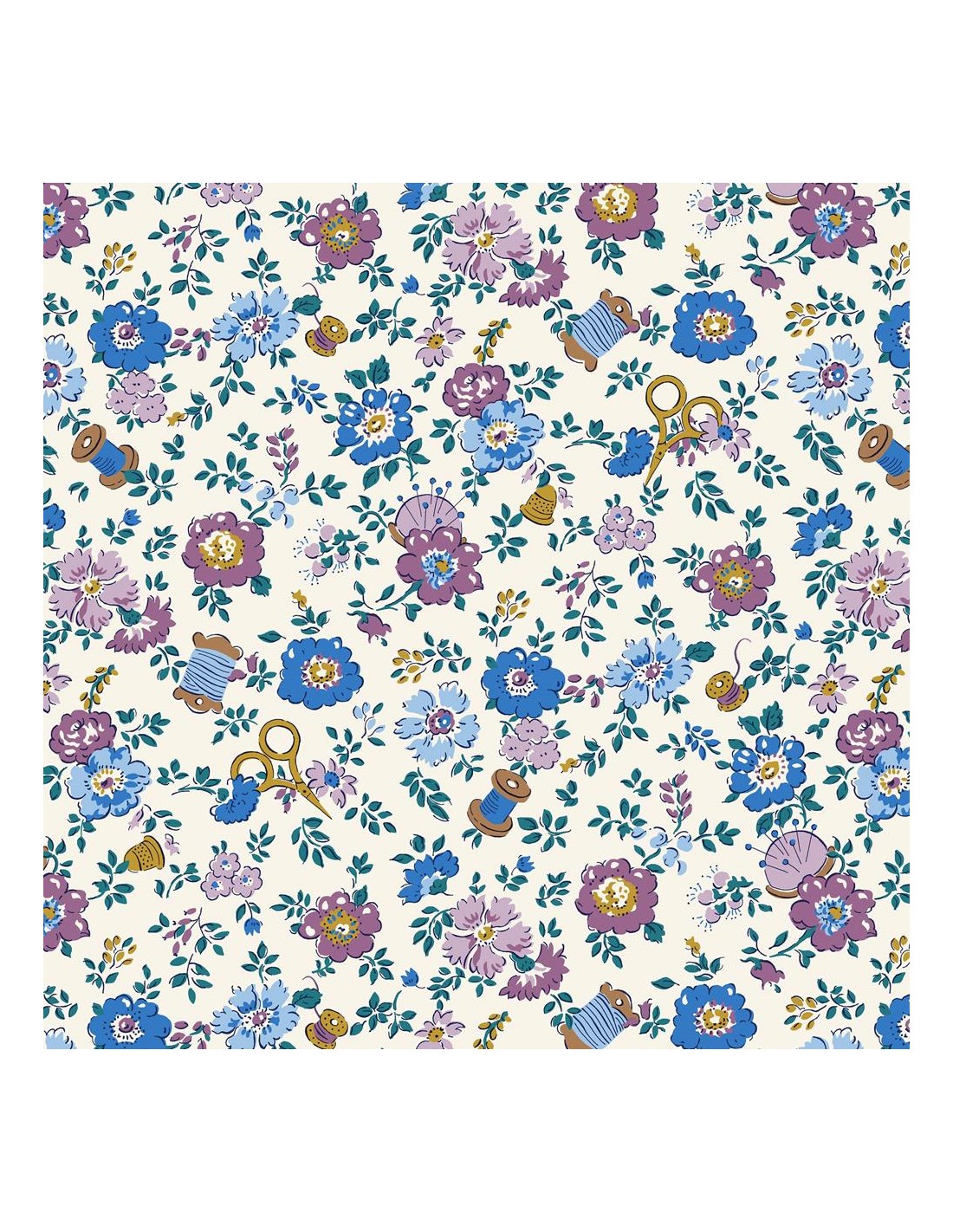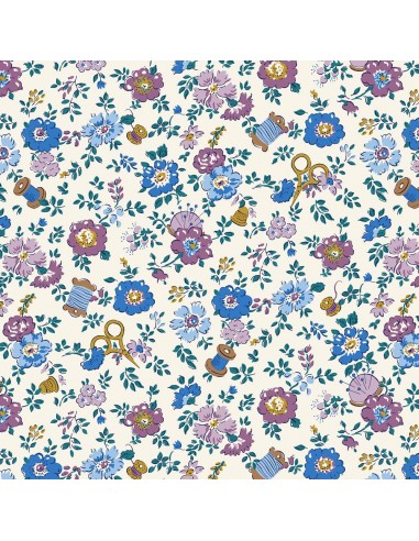 Tudor Celebration, Haberdashery Floral, Tessuto fondo crema con fiori e oggetti per il cucito in viola e blu - Liberty Fabrics