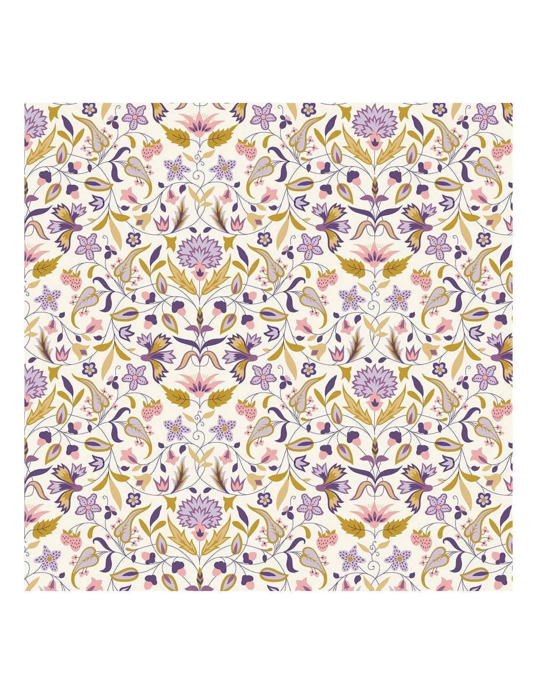 Traendo ispirazione da un'opera d'arte dipinta a mano scoperta nell'archivio Liberty, questo tessuto botanico ricadente in stile Arts & Crafts mette in mostra delicati rami sinuosi con garofani stilizzati, gigli, ghiande e foglie a forma di cuore. L'affascinante aggiunta di piccole fragole è un sottile accenno all'amato design di William Morris, Strawberry Thief.