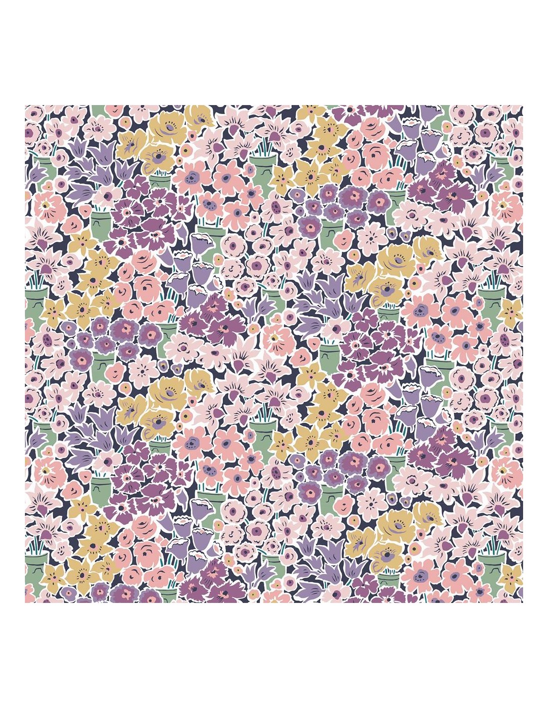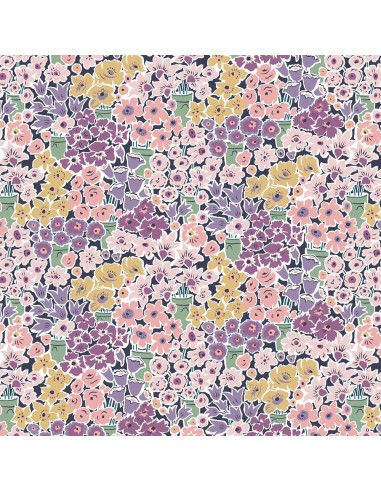 Tudor Celebration, Rossellie Blooms, Tessuto fondo blu con fitti vasi di fiori in rosa e giallo - Liberty Fabrics